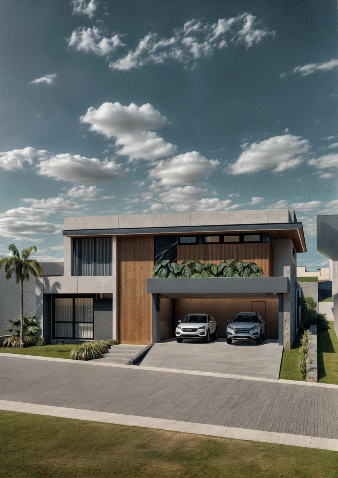 Os recuos, planos e balanços da fachada não são apenas visuais — eles estão conectados com as necessidades reais da rotina da família, proporcionando áreas de convivência, proteção solar e ventilação cruzada.